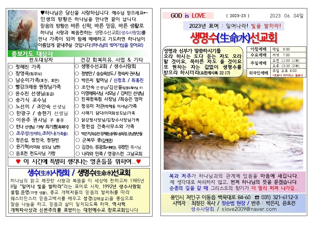 [주보] 2023년 6월 4일 용인 생명수 선교회 페이지 정보 작성자 관리자 댓글 0건 조회 96회 작성일 23-06-06 13:50 본문 [주보] 2023년 6월 4일 용인 생명수 선교회 목록 답변 이전글[성경통독] 시편 (23.6. 5. - 6. 11.) 23.06.06 다음글[주보] 2023년 6월 04일 춘천 봄내사랑교회 23.06.04 댓글목록 댓글목록 등록된 댓글이 없습니다.