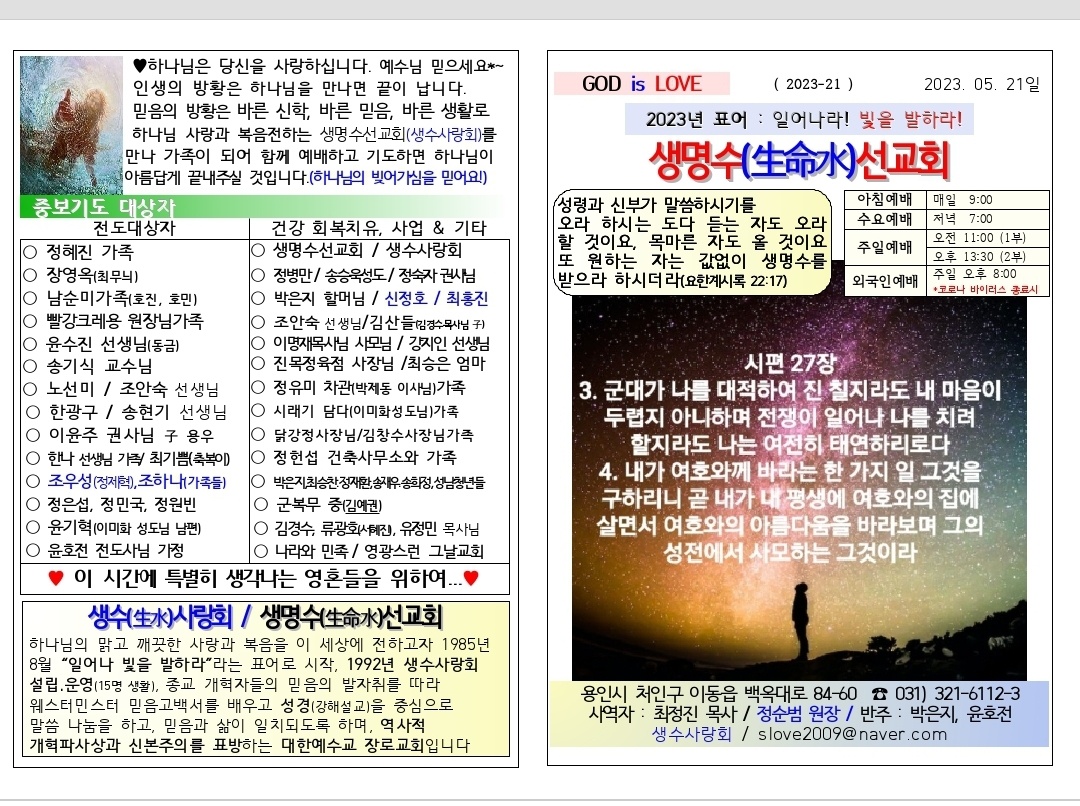 [주보] 2023년 5월 21일 용인 생명수 선교회 페이지 정보 작성자 관리자 댓글 0건 조회 108회 작성일 23-05-20 18:20 본문 [주보] 2023년 5월 21일 용인 생명수 선교회 목록 답변 이전글[성경통독] 시편 (23.5.22. - 5.28.) 23.05.21 다음글영성이란 무엇인가? 23.05.18 댓글목록 댓글목록 등록된 댓글이 없습니다.
