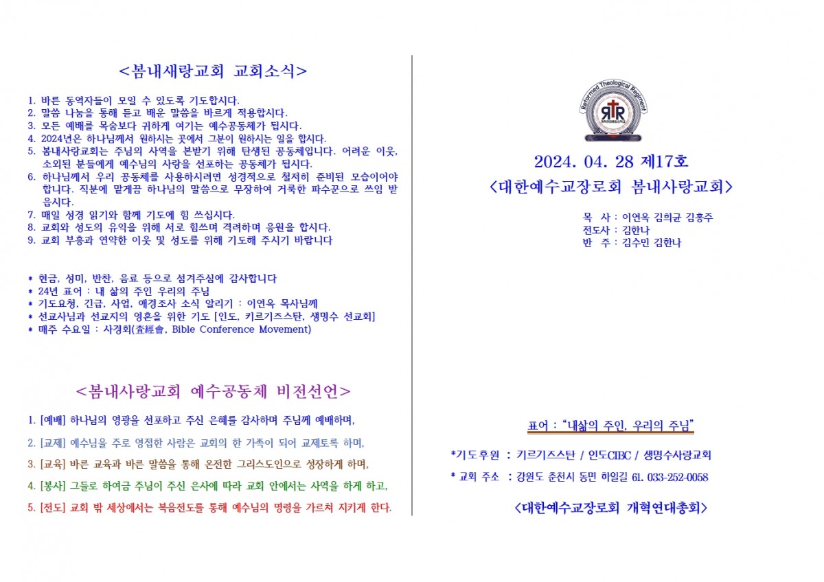 [주보] 2024년 04월 28일 춘천 봄내사랑교회 페이지 정보 작성자 관리자 댓글 0건 조회 20회 작성일 24-05-12 08:58 본문 [주보] 2024년 04월 28일 춘천 봄내사랑교회 목록 답변 이전글[주보] 2024년 05월 05일 춘천 봄내사랑교회 24.05.12 다음글[주보] 2024년 04월 21일 춘천 봄내사랑교회 24.05.12 댓글목록 댓글목록 등록된 댓글이 없습니다.