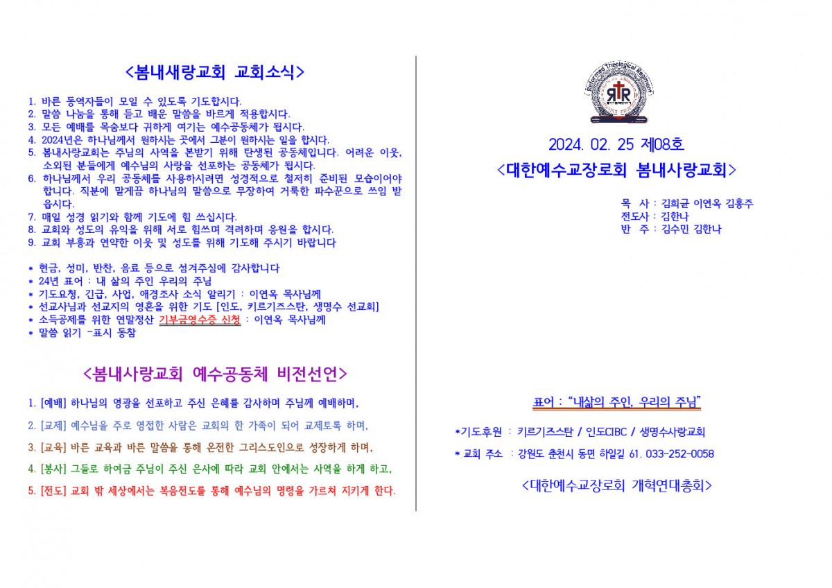 [주보] 2024년 02월 25일 춘천 봄내사랑교회 페이지 정보 작성자 관리자 댓글 0건 조회 33회 작성일 24-02-25 10:45 본문 [주보] 2024년 02월 18일 춘천 봄내사랑교회 목록 답변 이전글[주보] 2024년 03월 10일 춘천 봄내사랑교회 24.03.14 다음글[주보] 2024년02월25일 용인 생명수 선교회 24.02.24 댓글목록 댓글목록 등록된 댓글이 없습니다.