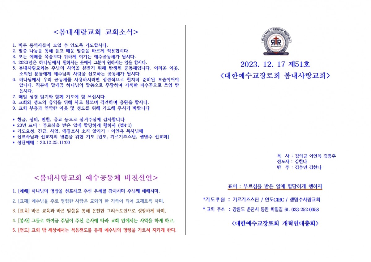 [주보] 2023년 12월 17일 춘천 봄내사랑교회 페이지 정보 작성자 관리자 댓글 0건 조회 31회 작성일 23-12-26 19:35 본문 [주보] 2023년 12월 17일 춘천 봄내사랑교회 목록 답변 이전글[주보] 2023년 12월 24일 춘천 봄내사랑교회 23.12.26 다음글[주보] 2023년12월24일 용인 생명수 선교회 23.12.25 댓글목록 댓글목록 등록된 댓글이 없습니다.