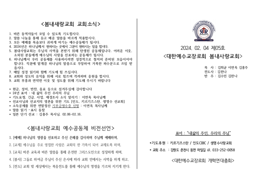 [주보] 2024년 02월 04일 춘천 봄내사랑교회 페이지 정보 작성자 관리자 댓글 0건 조회 34회 작성일 24-02-04 10:39 본문 [주보] 2024년 02월 04일 춘천 봄내사랑교회 목록 답변 이전글[주보] 2024년02월11일 용인 생명수 선교회 24.02.12 다음글[주보] 2024년 01월 21일 춘천 봄내사랑교회 24.01.30 댓글목록 댓글목록 등록된 댓글이 없습니다.