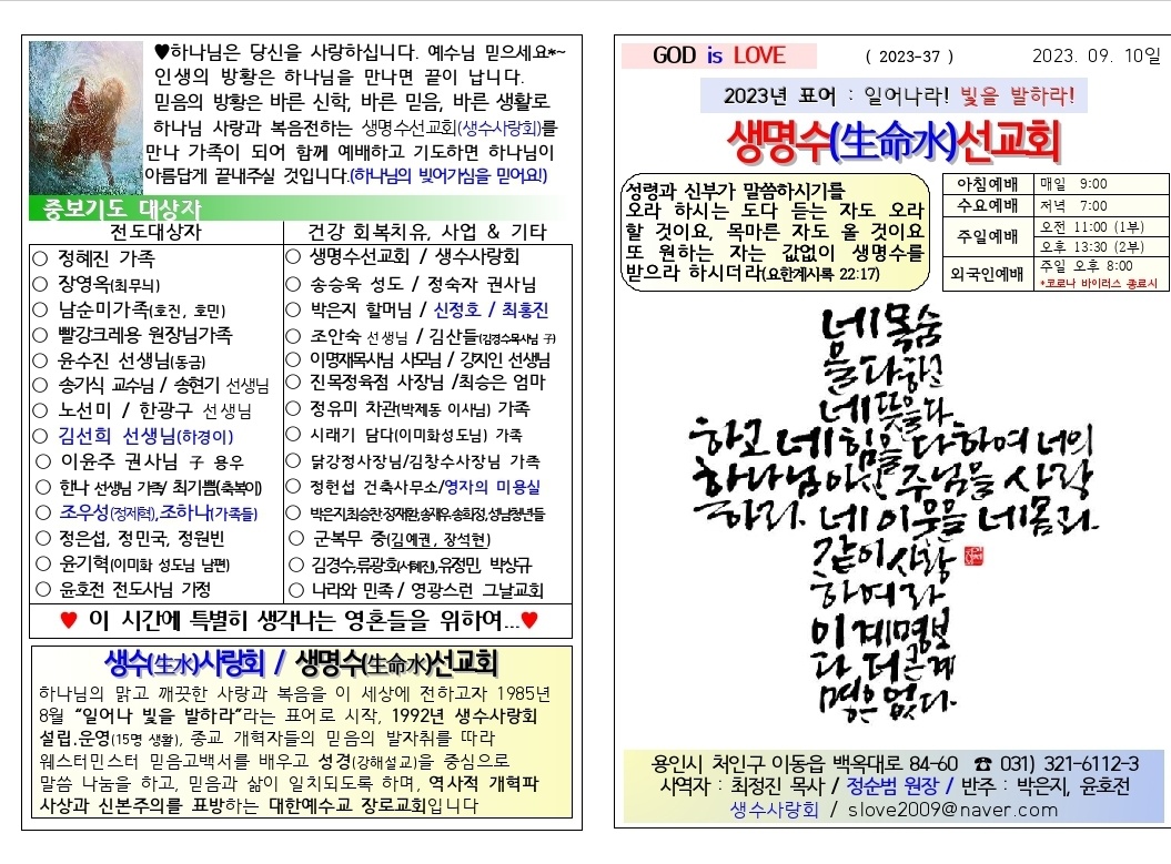 김희균님의 댓글 김희균 작성일 23-09-11 11:17 생명수 선교회에 하나님의 은총과 섭리가 더욱 가득하시길 간구합니다. 답변 삭제 생명수 선교회에 하나님의 은총과 섭리가 더욱 가득하시길 간구합니다.