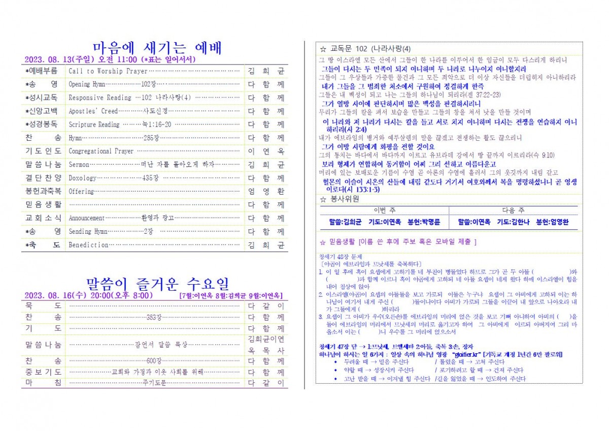 [주보] 2023년 8월 13일 춘천 봄내사랑교회 페이지 정보 작성자 관리자 댓글 1건 조회 148회 작성일 23-08-13 21:55 본문 [주보] 2023년 8월 13일 춘천 봄내사랑교회 목록 답변 이전글[주보] 2023년 8월 06일 춘천 봄내사랑교회 23.08.13 다음글[주보] 2023년 7월 30일 춘천 봄내사랑교회 23.08.13 댓글목록 댓글목록 김희균님의 댓글 김희균 작성일 23-08-22 09:38 성령의 충만함을 입어 이스라엘 자손을 주 곧 저희 하나님께로 많이 돌아오게 하겠음이니라... 많이 돌아 오게 해야 합니다. 엘리야의 심령과 능력으로, 아버지의 마음을 자식에게 주는 마음으로 말입니다. 답변 삭제 성령의 충만함을 입어 이스라엘 자손을 주 곧 저희 하나님께로 많이 돌아오게 하겠음이니라... 많이 돌아 오게 해야 합니다. 엘리야의 심령과 능력으로, 아버지의 마음을 자식에게 주는 마음으로 말입니다.