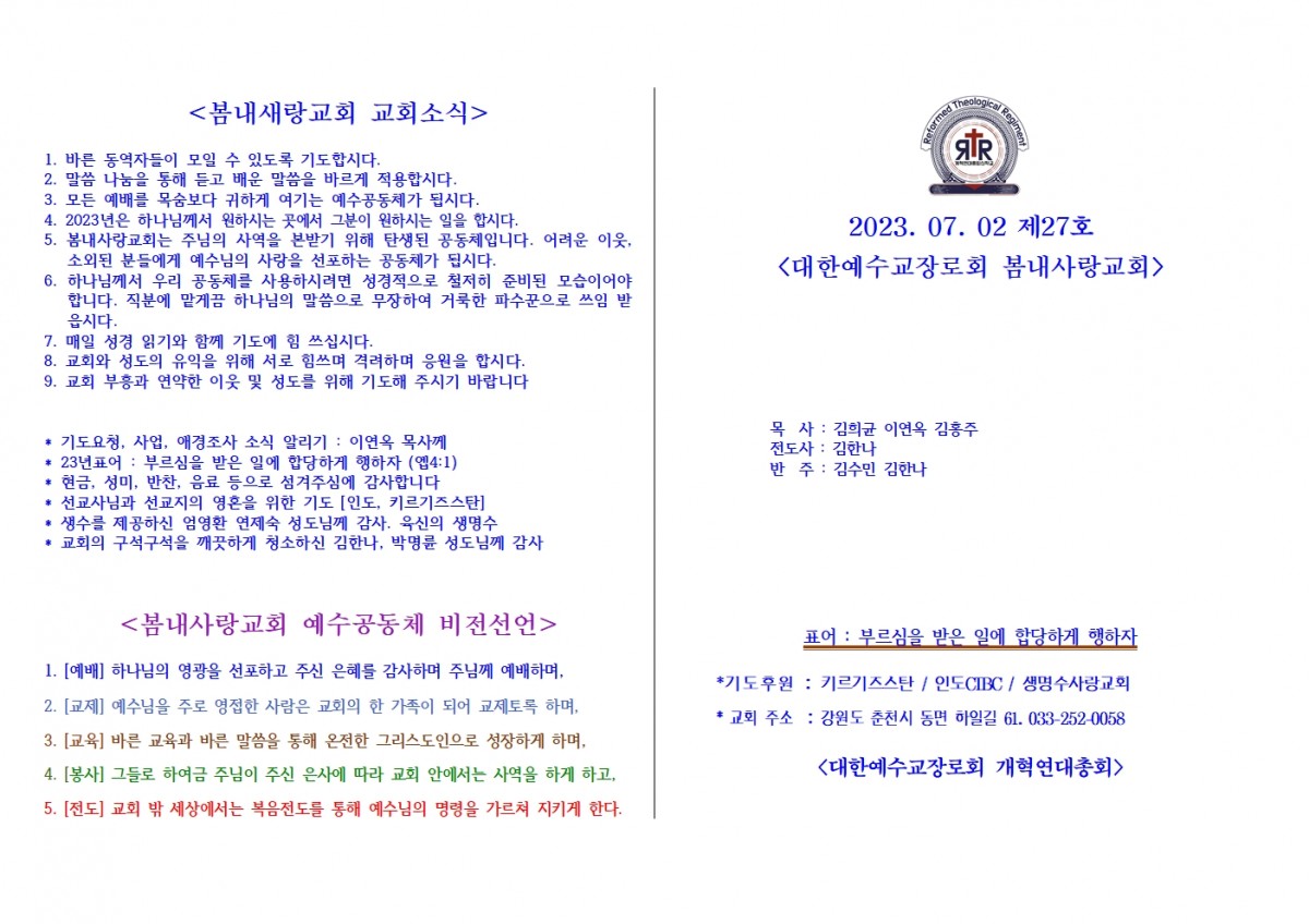 [주보] 2023년 7월 02일 춘천 봄내사랑교회 페이지 정보 작성자 관리자 댓글 0건 조회 84회 작성일 23-07-02 17:23 본문 [주보] 2023년 7월 02일 춘천 봄내사랑교회 목록 답변 이전글[성경통독] 2023. 07. 03. - 07. 09. 23.07.02 다음글창세기41장 통독 및 문제 23.06.26 댓글목록 댓글목록 등록된 댓글이 없습니다.