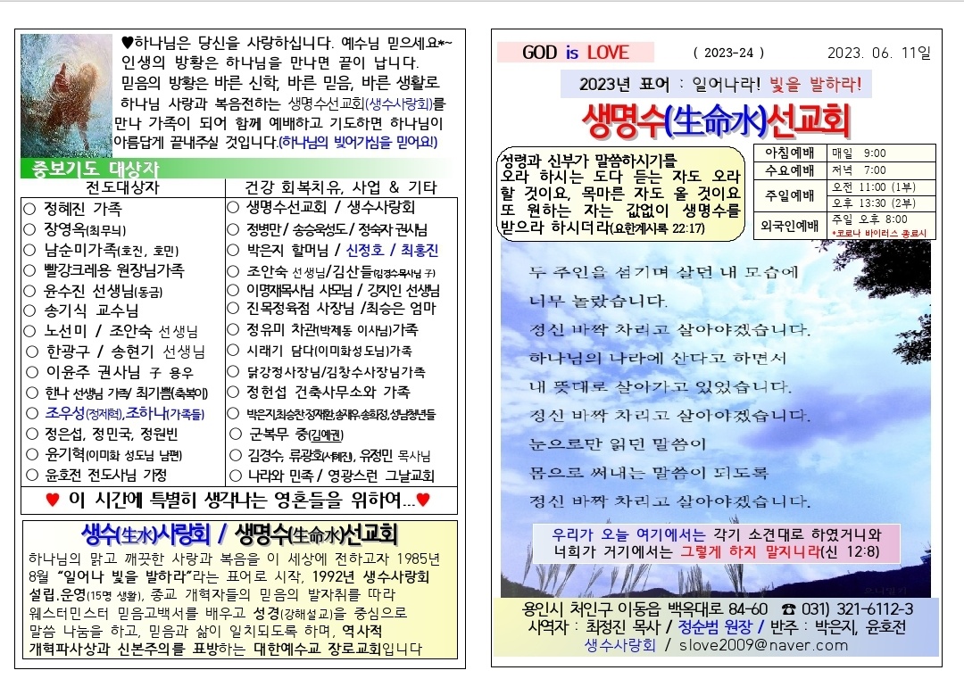 [주보] 2023년 6월 11일 용인 생명수 선교회 페이지 정보 작성자 관리자 댓글 1건 조회 148회 작성일 23-06-10 17:34 본문 [주보] 2023년 6월 11일 용인 생명수 선교회 목록 답변 이전글[성경통독] 시편 (2023.06.12. - 06.18.) 23.06.11 다음글[성경통독] 시편 (23.6. 5. - 6. 11.) 23.06.06 댓글목록 댓글목록 김희균님의 댓글 김희균 작성일 23-06-13 19:41 예배가 삶이 되고 삶이 예배되는 생명수 선교회. 참으로 귀하신 하나님의 일터입니다. 답변 삭제 예배가 삶이 되고 삶이 예배되는 생명수 선교회. 참으로 귀하신 하나님의 일터입니다.