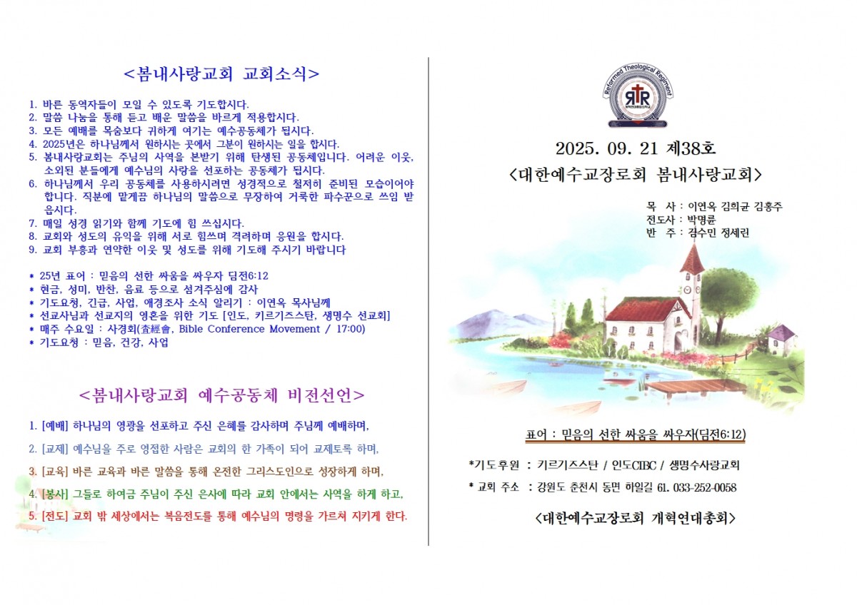 [주보] 2025년 09월 21일 38호 춘천 봄내사랑교회 페이지 정보 작성자 관리자 댓글 0건 조회 10회 작성일 25-09-29 14:48 본문 [주보] 2025년 09월 21일 38호 춘천 봄내사랑교회 목록 답변 이전글[주보] 2025년 09월 28일 39호 춘천 봄내사랑교회 25.09.29 다음글[주보] 2025년 09월 14일 37호 춘천 봄내사랑교회 25.09.29 댓글목록 댓글목록 등록된 댓글이 없습니다.