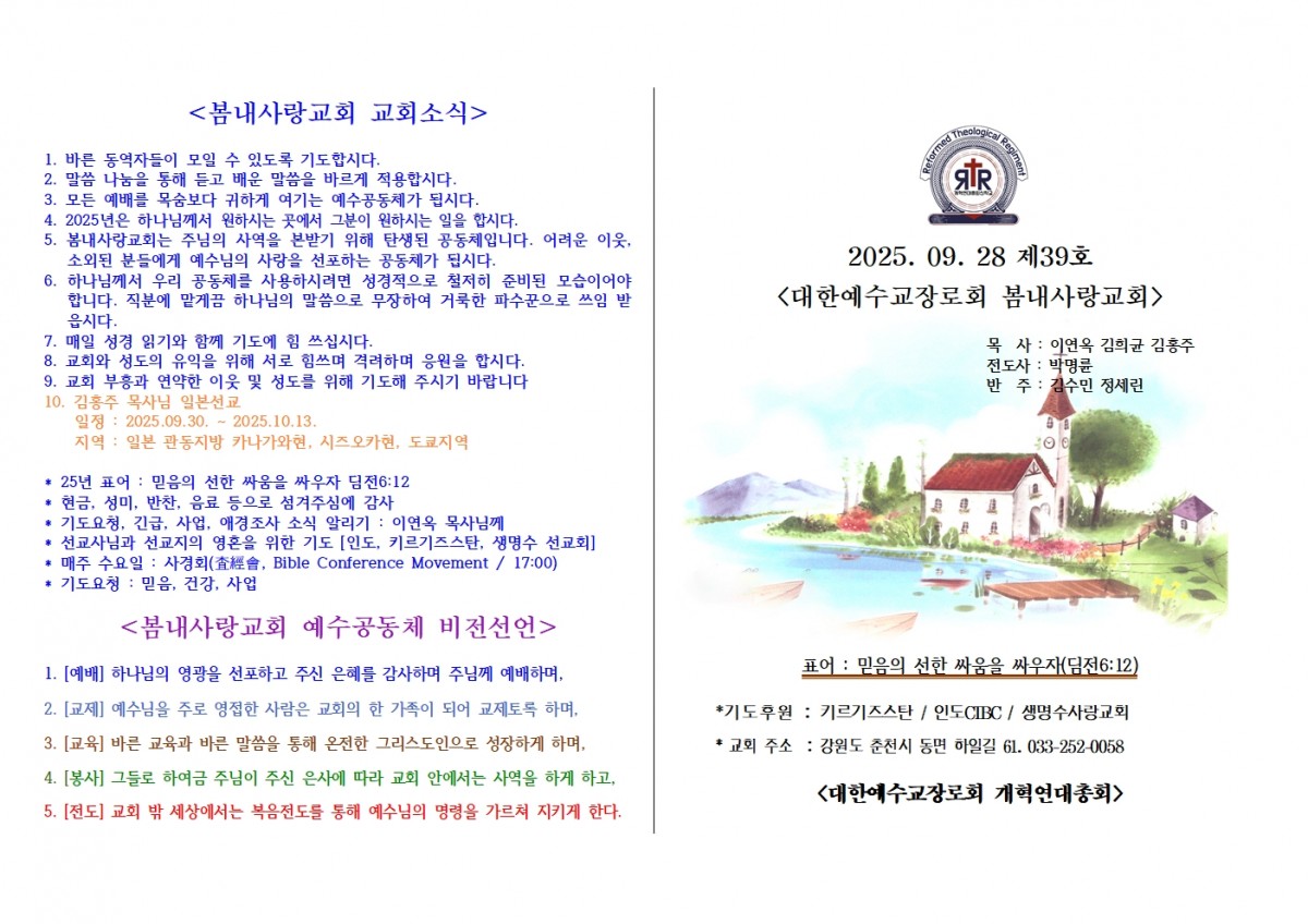 [주보] 2025년 09월 28일 39호 춘천 봄내사랑교회 페이지 정보 작성자 관리자 댓글 0건 조회 6회 작성일 25-09-29 14:49 본문 [주보] 2025년 09월 28일 39호 춘천 봄내사랑교회 목록 답변 이전글[주보] 2025년 10월 05일 40호 춘천 봄내사랑교회 25.10.04 다음글[주보] 2025년 09월 21일 38호 춘천 봄내사랑교회 25.09.29 댓글목록 댓글목록 등록된 댓글이 없습니다.