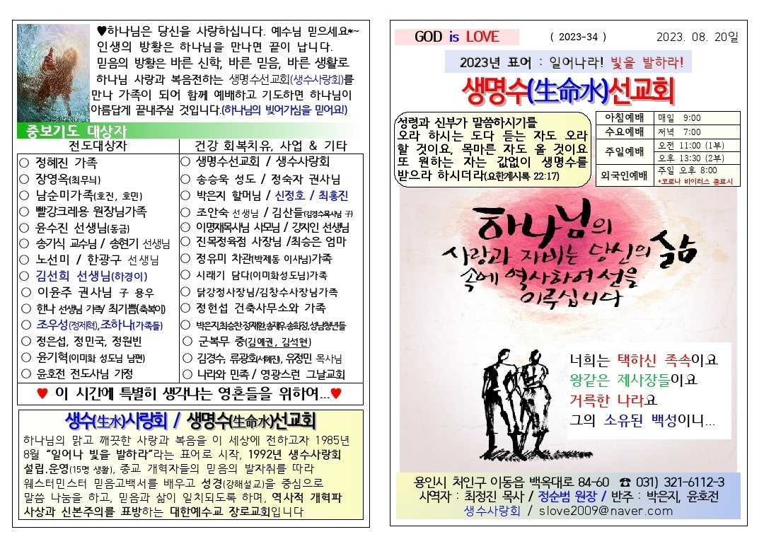 [주보] 2023년 8월 20일 용인 생명수 선교회 페이지 정보 작성자 관리자 댓글 1건 조회 175회 작성일 23-08-23 10:54 본문 . 목록 답변 이전글[주보] 2023년 8월 27일 춘천 봄내사랑교회 23.08.28 다음글이번 주 성경통독은 에스겔 입니다 ♡ 23.08.23 댓글목록 댓글목록 김희균님의 댓글 김희균 작성일 23-08-25 12:17 하나님 당신은 사랑입니다. 생명수 선교회도 사랑입니다. 답변 삭제 하나님 당신은 사랑입니다. 생명수 선교회도 사랑입니다.